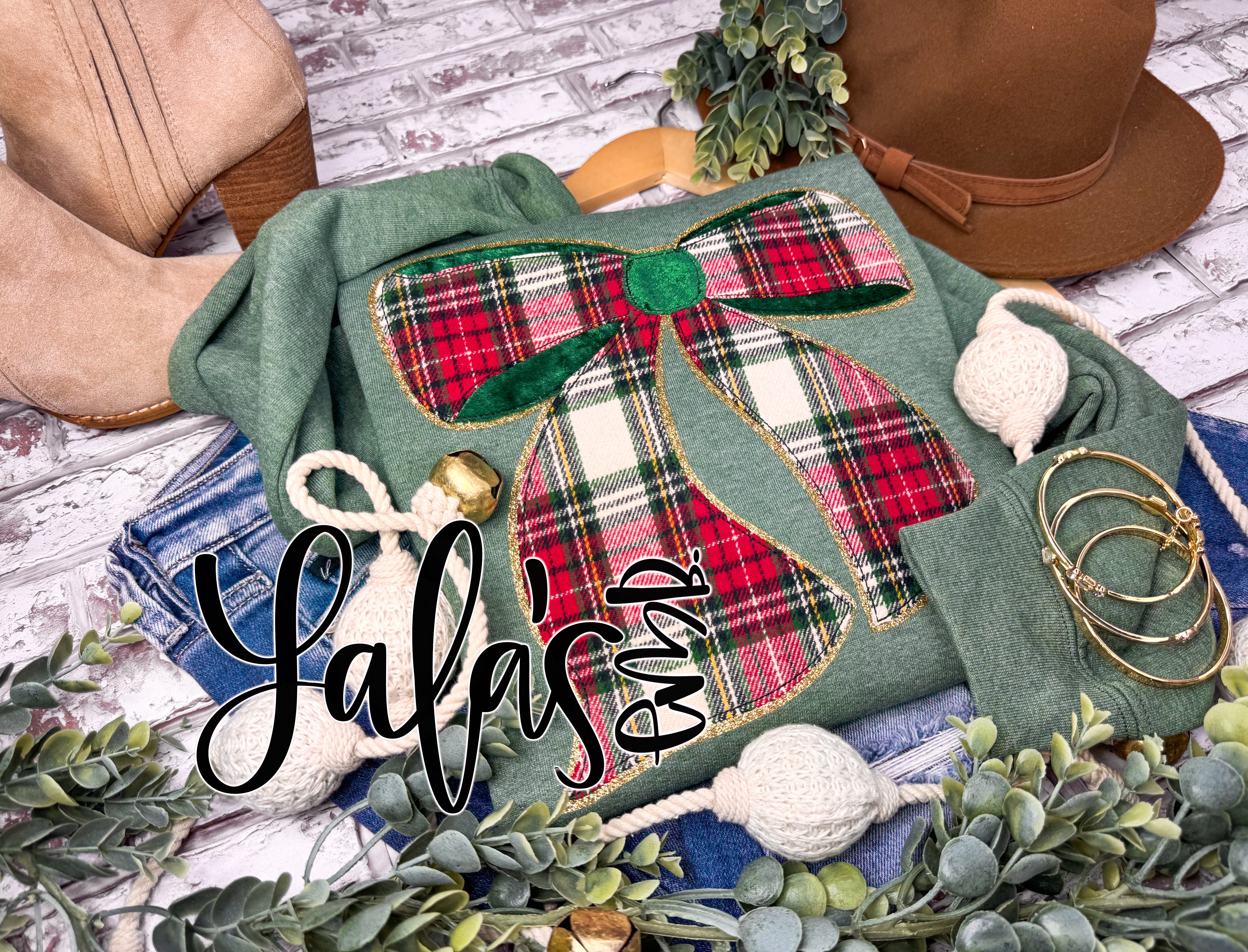 Say no more! One of the Vintage Christmas designs LaLa's created that we are sure you will need this holiday season. (; The design is actually stitched with all the textured fabrics giving it all the love. Layered with a shine to give it a fun pop. This design is a FULL FRONT bow. (;